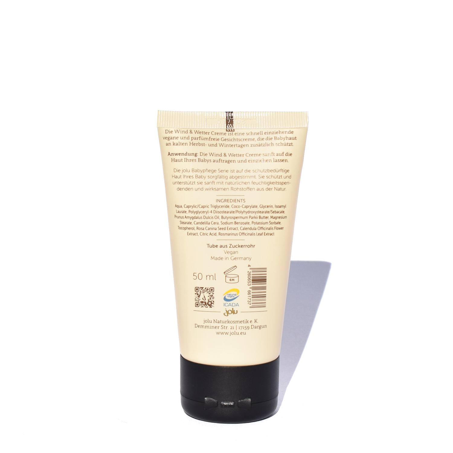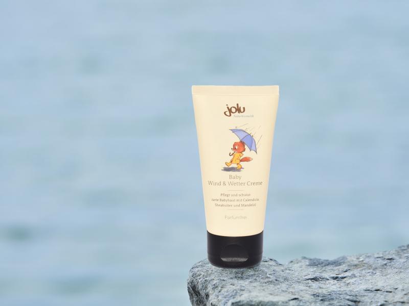 Die Jolu Mandel Baby Creme Wint & Wetter pflegt sanft mit Bio Mandelöl, Hagebuttenkernöl, Shea Butter und Calendula.